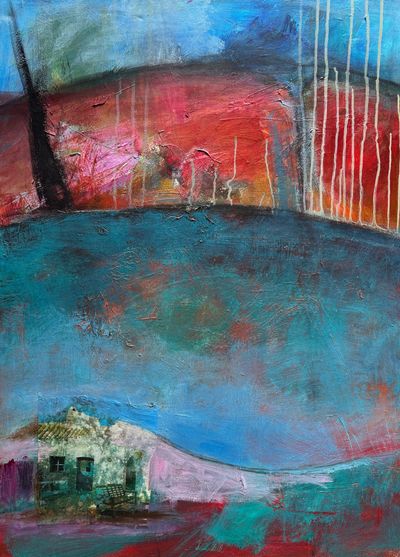 This painting was inspired by my time in Ibiza, Spain which was my stomping ground for a few years in the 80s. One night we sat in front of the finca my friends and I had rented and looked at the sky with all the stars and the full moon.