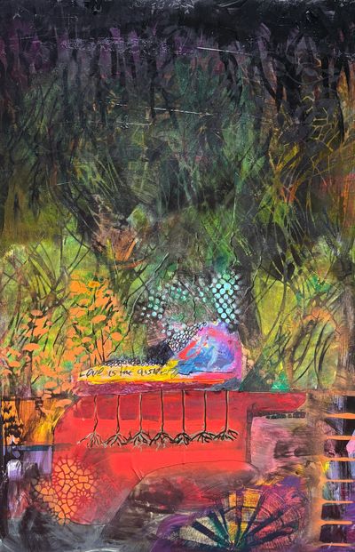 He collects horse manure, chicken shit, leaves, grass cuttings and of course compost. He puts so much love and energy in making good dirt. This thought was in the back of my head when I created this painting. When you give enough love to the grounds and dirt, everything will thrive.